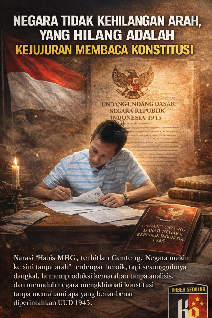 Narasi “Habis MBG, terbitlah Genteng. Negara makin ke sini tanpa arah” terdengar heroik, tapi sesungguhnya dangkal. Ia memproduksi kemarahan tanpa analisis, dan menuduh negara mengkhianati konstitusi tanpa memahami apa yang benar-benar diperintahkan UUD 1945.